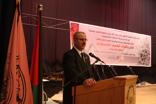 اما الاستاذ الدكتور رامي حمد الله، رئيس الجامعة فقال: "بداية يسعدني أن أرحب بكم ترحيباً حاراً لنلتقي معاً في هذا اليوم في "المؤتمر الثاني للفن والتراث الشعبي الفلسطيني، واقع وتحديات" فأهلاً بكم جميعاً في رحاب جامعة النجاح الوطنية بيت كل الفلسطينيين ومعقل العلم والمعرفة". واضاف إن التراث يشكل هوية وثقافة الامة، وقد كثر الكلام والتأليف حوله، وكانت المنطقة العربية وفلسطين خاصة أرضاً لتراث كثير من الامم لموقعها في قلب العالم القديم الذي شكل مهداً لحضارات الأمم على مرور الزمان مما جعلها هدفاً لكثير من الصراعات والحروب مما يؤثر على تراثها ويفرض على الجميع زيادة الاهتمام بالتراث وحمايته أثناء النزاعات وبعدها لأن التراث كما قلت هو من أهم وسائل المحافظة على هوية الشعب بل والانسانية اجمع وبالتالي فإن التراث هو نتاج الانسانية وملك لها جميعاً، ومن هنا وضعت القوانين والتشريعات الدولية لأن التراث تشكله نتاجات مادية وروحية من الإرادات الخيرة في ميادين الحياة الانسانية فهو أرشيف للآباء والأجداد ."