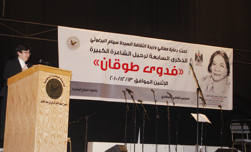 أقيم مساء الاثنين 13/12/2010 في مسرح سمو الأمير تركي بن عبد العزيز في الحرم الجديد احتفال خاص بمناسبة مرور سبعة أعوام على وفاة الشاعرة الفلسطينية الكبيرة فدوى طوقان، وقد نظم الاحتفال المجلس الثقافي الاستشاري في محافظة نابلس بالتعاون مع جامعة النجاح الوطنية وتحت رعاية معالي السيدة سهام البرغوثي وزيرة الثقافة وبحضورها بالاضافة الى عطوفة اللواء جبرين البكري، محافظ محافظة نابلس والأستاذ الدكتور ماهر النتشة، نائب رئيس جامعة النجاح الوطنية للشؤون الاكاديمية والشاعر مراد السوداني، رئيس اتحاد الكتاب الفلسطينيين ونخبة من الشعراء والمثقفين والأدباء الذين قدموا من مختلف محافظات الوطن.