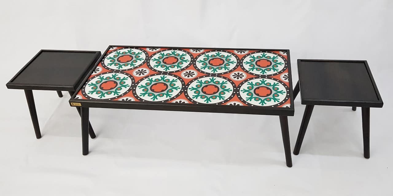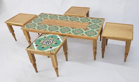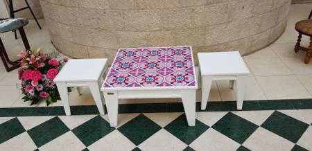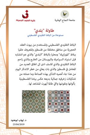 تم استيحاء خطوط تصميم مجموعة من طاولات الوسط من البلاط التقليدي الفلسطيني والمستخدم من بيوت العقد الحجرية من مناطق مختلفة من فلسطين والمعروف عالميا ببلاط "الموزاييك" ومحليا بالبلاط "البلدي" والذي عم انتشاره قبل استيراد السيراميك والبورسلان من الخارج والذي زاحم البلاط التقليدي والذي للاسف ادى الى اغلاق العديد من المعامل في فلسطين والذي بات يعاني من خطر الاندثار اليوم. من هذا جاء أهميه التذكير بهذه الصناعة وماحملته من تشكيلات زخرفيه جمالية بديعه عكس بيئتنا الفلسطينية بألوانها ونقوشها وااتي طالما أبهرت المشاهد لها. في سلسلة من الاعمال المستوحاه من البلاط التقليدي الفلسطيني تارة تم اللجوء إلى استخدام خطوطه وألوان البلاط التقليدي كما هو ولكن مع التلاعب بتقنيات ادخاله بقطعة الاثاث من حيث الخامة المستخدمة وطريقة تركيبها وتوظيفها بالقطعة المنشودة، حيث تم اللجوء الى الطباعة الرقمية الحديثة لاشكال للبلاطات بعد رسمها وتلوينها ببرامج الحاسوب بشكل مطابق ومن ثم اللجوء الى مواد الريزن للحفاظ على هذه المواد المطبوعة من التلف والتي يعطيها متانة فريدة للتحمل وثبات الالوان وحمايتها من التلف مع استخدام ماكنات حديثة محوسبه في عملية خرط الأرجل الحاملة للسطح. في اقتراح ثاني لتطويع الاشكال القليدية للبلاط بحيث تواكب العصر الحديث لدفع الشباب لاستخدامها بمساكنهم الحديثة وتعبيرا عن روح الشباب وحب الانطلاق والتجديد والصراحه في التعبير تم اللجوء الى ذات الخطوط التقليدية ولكن مع تغيير اللالوان بألوان شبابية حديثة تعبر عن الطاقة والنشاط وحب المغامرة وكل ماهو جديد. من هنا تم اللجوء الى ألوان الطباعة الرئيسية والمعروفة اختصار (CMYK) مع استخدام الابيض النقي كخلفية للعمل واللجوء لمادة الريزن للاسباب السابقة مع ملاحظة أنه تم التركيز على عامل السعر في هذا التصميم حيث ان القطع الموجهه للشباب يمكن انتاجها بكميات كبيرة وباسعار منافسة للقطع الاقتصادية في السوق المحلي. يهدف ذلك لتبيان أن القطعة التي تعكس مورثات الشعب الفلسطيني وهويته ليس من الضروري أن تكون محصورة بطبقة محدودة من الميسورين من الشعب ذوي الدخل المرتفع وانما يمكن ان تغطي شريحة عريضة من المجتمع بذات الوقت لكونها اقتصادية وعملية ومتوفرة بكميات كبيرة بنفس الوقت التي تعكس فيه عمق وحضارة الشعب الفلسطيني والتي يجب أن يفتخر بها جميع الاجيال القادمة على مختلف احتياجاتهم وامكانياتهم المادية. الاقتراح الثالث لقطعة أثاث مستوحاه من البلاط التقليدي الفلسطيني بجانب احتوائها على ماسبق توفر جودة عالية من الاخشاب الطبيعية الصلبة من البلوط الطبيعي أو الزان ولكن بآلية تصنيع متطورة ولكن بذات الوقت بسيطة وبكميات وزمن قياسي مما يوفرها باسعار منافسه وذلك بسبب سهولة ألية تصنيعها وتخزينها ونقلها بذات الوقت.