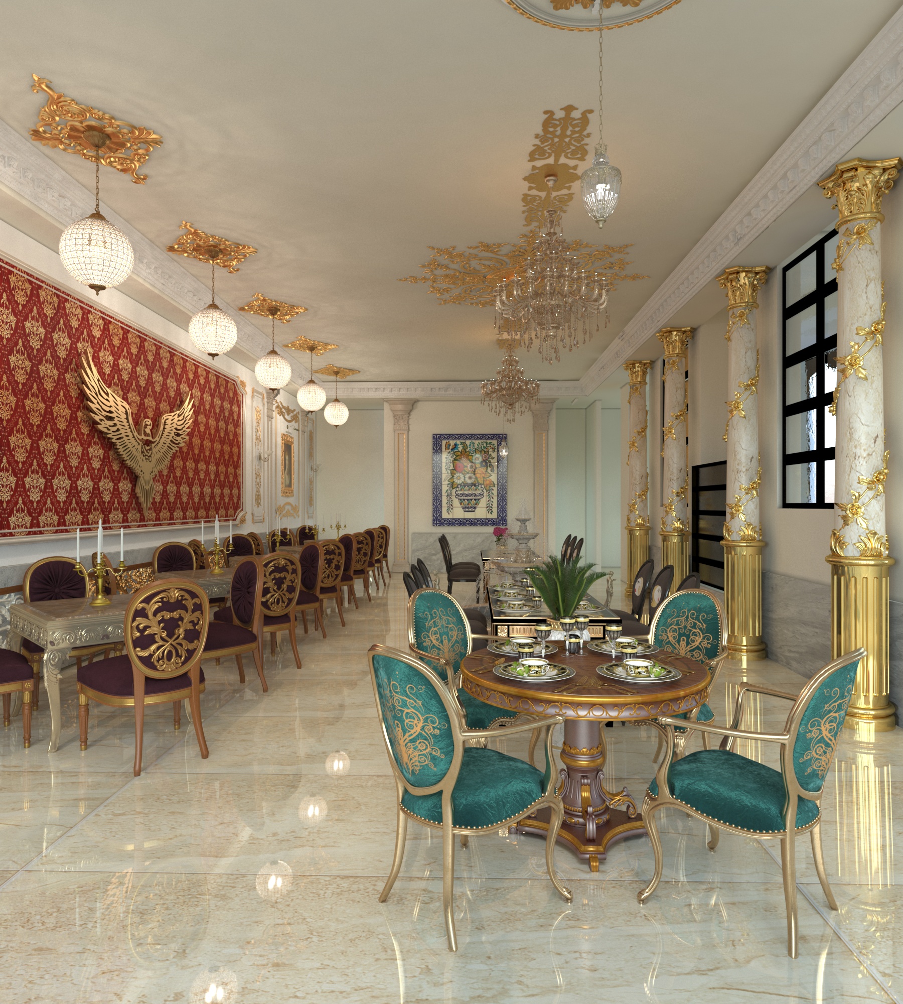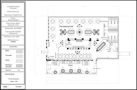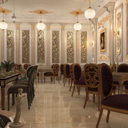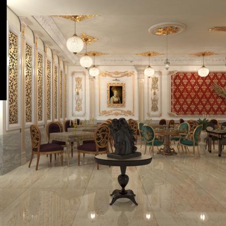 المشروع تصميم داخلي لمطعم عرقي روسي 3 نجم صالة مكونت من طابق ارضي وترس مطل على الشارع يحتوي على مساحة 240 متر مربع يحتوي على عدة مناطق منها الاستقبال والانتظار ومنطقة مخصصة لعرض الماكولات وبار للمشروبات وصالة الطعام وترس ونقاط الخدمة ومن الناحية الجمالية والتعبيرية يوجد نافورة مياه وبعض اللوحات الروسية المشهورة عبر تاريخهم وتماثيل من الرخام الدالة على الثقافة الروسية مثل الحصان يدل على الاناقة والجمال والثراء والاصالة دلالة على القوة استخدام الاعمدة الاكلاسيكية كعنصر انشائي وتحقيق مبدا التوازن والتماثل في التوزيع الوظيفي والتصميم الداخلي تم الاعتماد على الالوان الفاخرة لتعزيز مضاهر الثراء والقوة كاللون الذهبي والبيج واطياف البني المحروق في بعض قطع الاثات ويبقى للون الاحمر المتوهج رمز النمط الروسي بسطوته وحرارته فيطغى على الاثاث وبعض الاكسسوارت في حين يتم اضافة للمسات الذهبية لتعزيز القوة استخدام ورق ذات ملمس زخرفي يدل على الثقافة الروسية